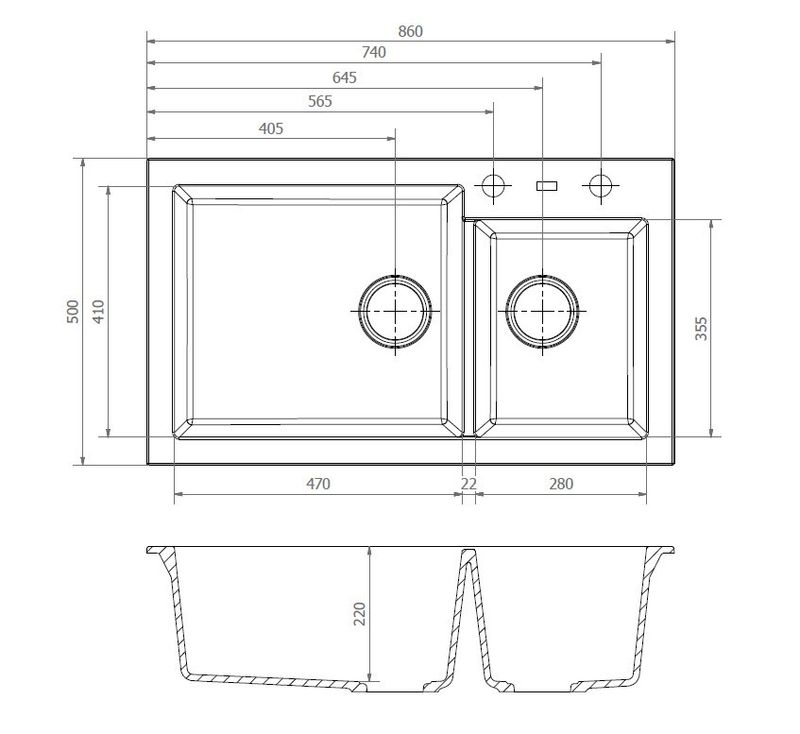 • Abmessung der Spüle: 470 x 410 + 280 x 355 mm