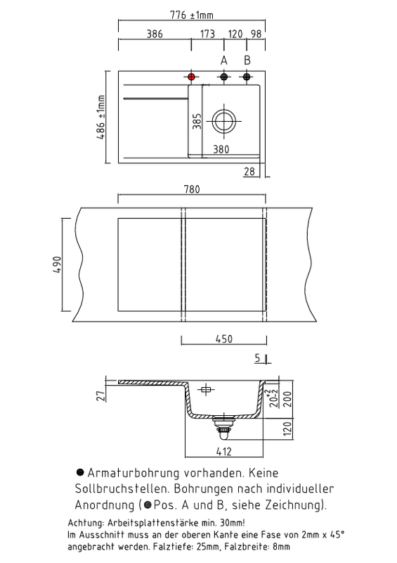 • diese Spüle ist nur als flächenbündige Spüle einbaubar (somit nur in Kombination mit Stein- oder Granitarbeitsplatten); ein Einbau als Einbau- bzw. Auflage-Spüle oder der Einsatz als Unterbau-Spüle ist nicht möglich! Es gibt von diesem Modell jedoch eine Schwester-Variante, die für den Einbau vorgesehen ist