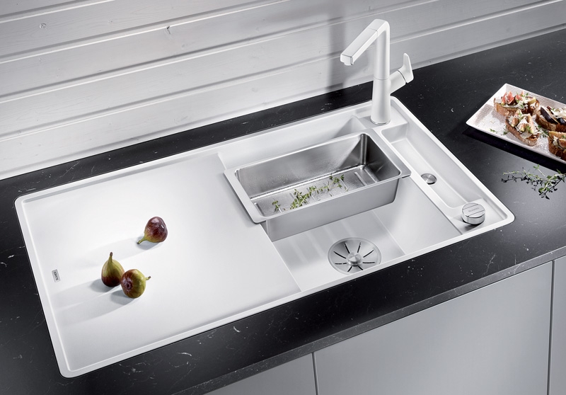• Verschiebbares Schneidbrett zum Hineinarbeiten in Hauptbecken, Schale oder Abtropfmulde (Glasschneidbrett weiss)