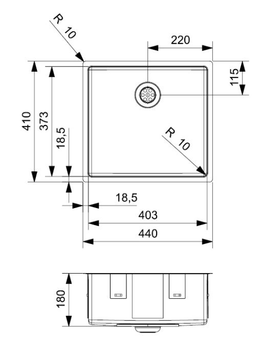 • Abmessung der Spüle: 403 x 373 mm