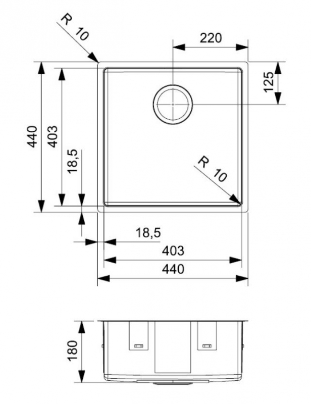 Abmessung der Spüle: 403 x 403 mm