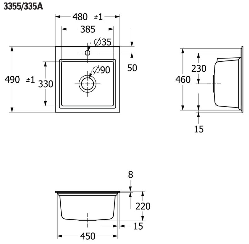 - Spülenmaße: L x B 490 x 480 mm