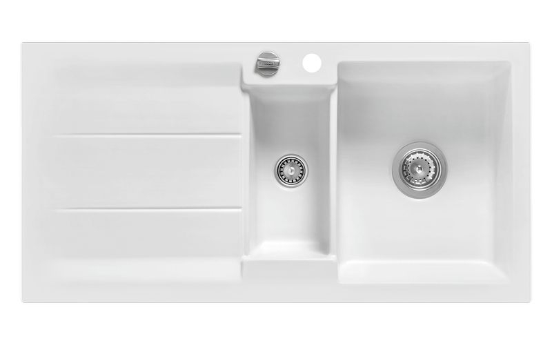 Hinweis: ist auf der oben stehenden Produktabbildung auf der Spüle ein runder Drehknebel zu sehen, handelt es sich um die Version mit Excenter-Betätigung. Eine eventuell abgebildete Armatur gehört nicht zum Lieferumfang.