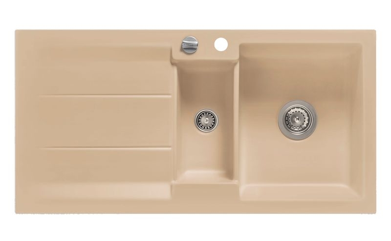 Hinweis: ist auf der oben stehenden Produktabbildung auf der Spüle ein runder Drehknebel zu sehen, handelt es sich um die Version mit Excenter-Betätigung. Eine eventuell abgebildete Armatur gehört nicht zum Lieferumfang.