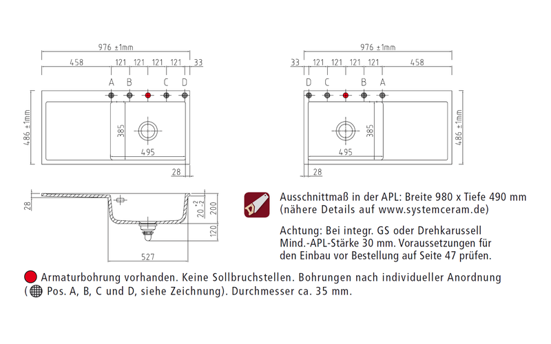 • Der Auslieferungszustand der Spüle beinhaltet eine Lochbohrung für die Armatur. Es sind keine Sollbruchstellen vorhanden; eine oder weitere Durchbohrung(en) kann nur im Werk des Herstellers Systemceram vorgenommen werden. Bitte geben Sie uns dafür exakt die von Ihnen gewünschte Position auf der Spüle an, gern auch anhand einer separaten Email, oder nehmen Sie diesbezüglich mit uns Kontakt auf. Bitte beachten Sie auch, daß Sie durch diese persönliche Positionierung der Lochbohrung einen für Sie individualisierten Artikel bestellen und erwerben, der nur für Sie speziell angefertigt wird. Diese Individualisierung und die damit verbundene nicht gegebene Möglichkeit eines anderweitigen Verkaufes durch uns kann zu einem Nicht-Wirksamwerden des Widerrufrechtes führen, welches individualisierte Produkte ausdrücklich ausnimmt. (Auf eine mit Produktmängeln zusammenhängende Reklamation hat dies selbstverständlich keinen Einfluß). Bitte sprechen Sie uns ggfs. hierauf an.