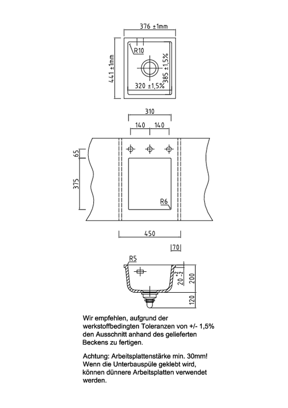 • Ausschnittsmaß in der Arbeitsplatte: 310 x 375 mm / R 6 mm