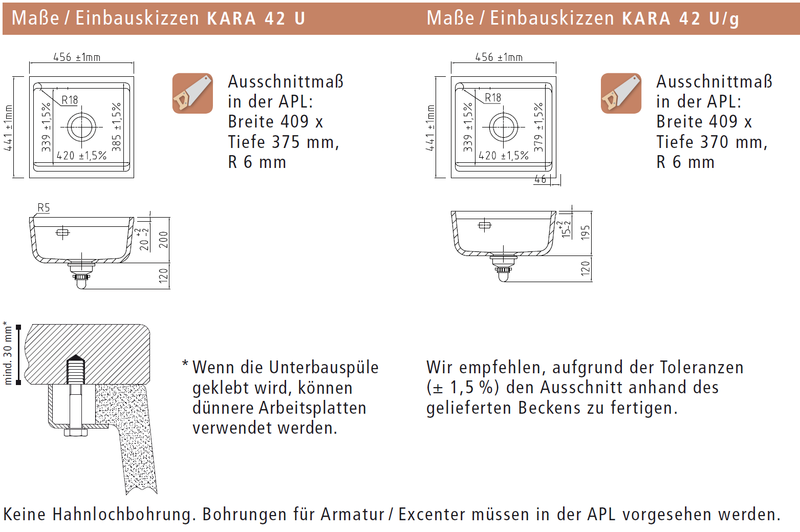 • Ausschnittsmaß in der Arbeitsplatte: 409 x 370 mm / R 6 mm