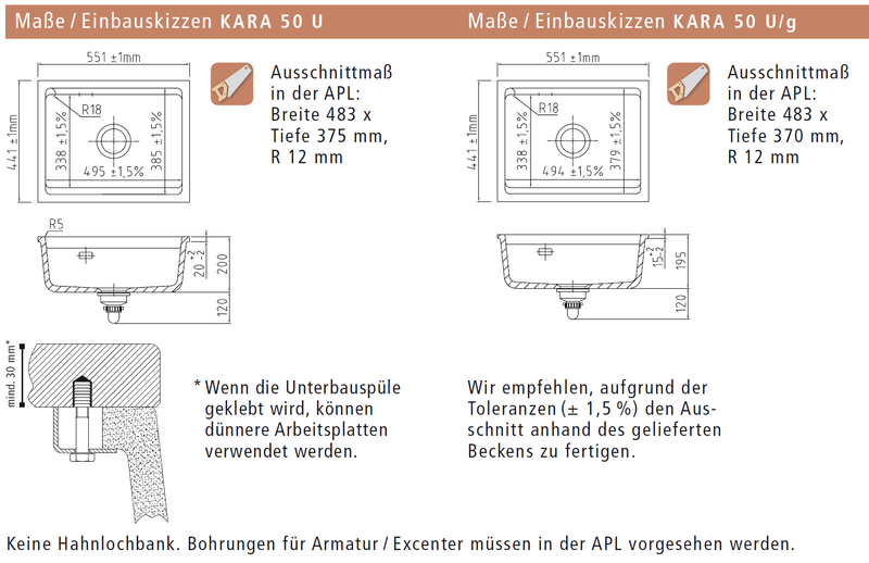 • Ausschnittsmaß in der Arbeitsplatte: 483 x 375 mm / R 12 mm