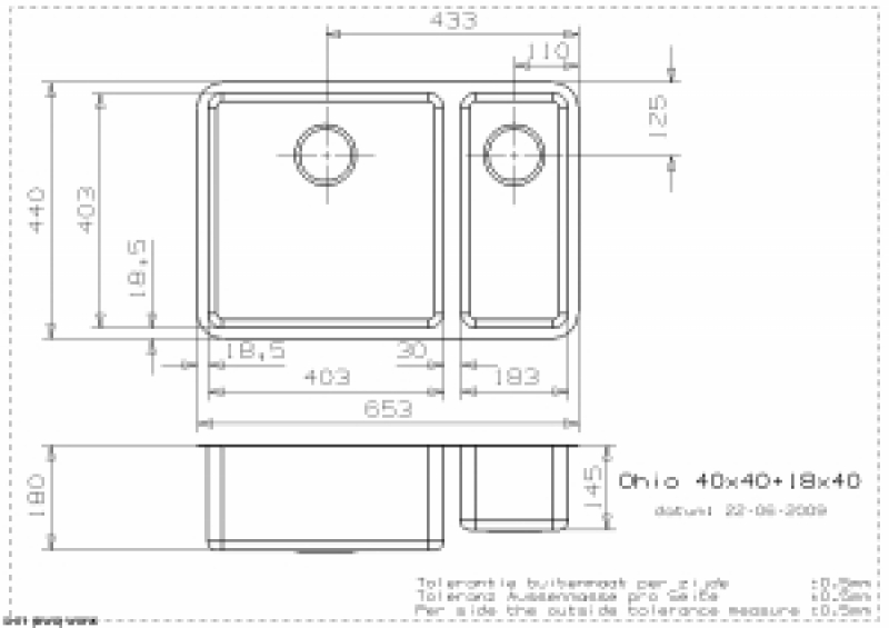 • Abmessung der Spüle: 403 x 403 mm/183 x 403 mm
