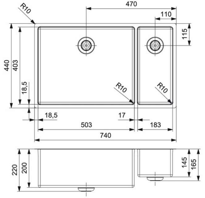 • Abmessung der Spüle: 503 x 403 / 183 x 403 mm