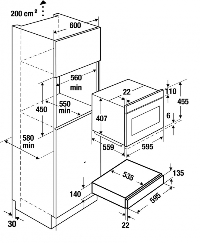 • Nischenmaße B x H x T ca. 560 x 595 x min. 550 mm