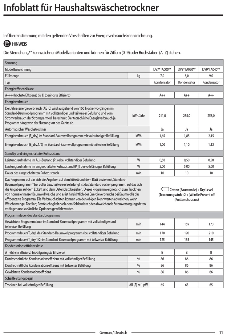 - Die Informationen auf dem Etikett und dem Datenblatt beziehen sich auf folgende Programme3) Baumwolle + Trockengrad 2