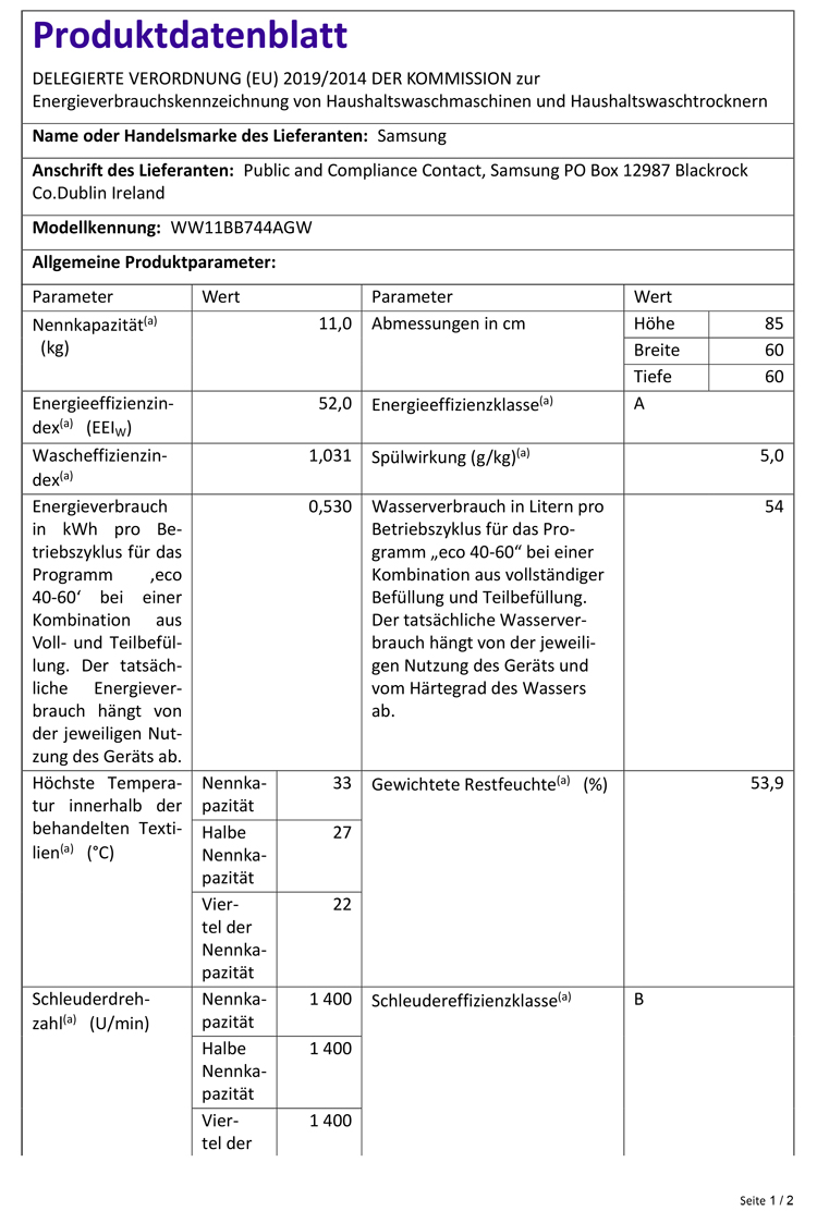 - Gewichteter Energieverbrauch „Eco 40-60“ ** 0.53 kwh/Zyklus
