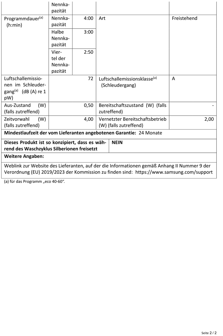 - Luftschallemissionen während des Schleuderzyklus 72 dB(A) re 1 pW