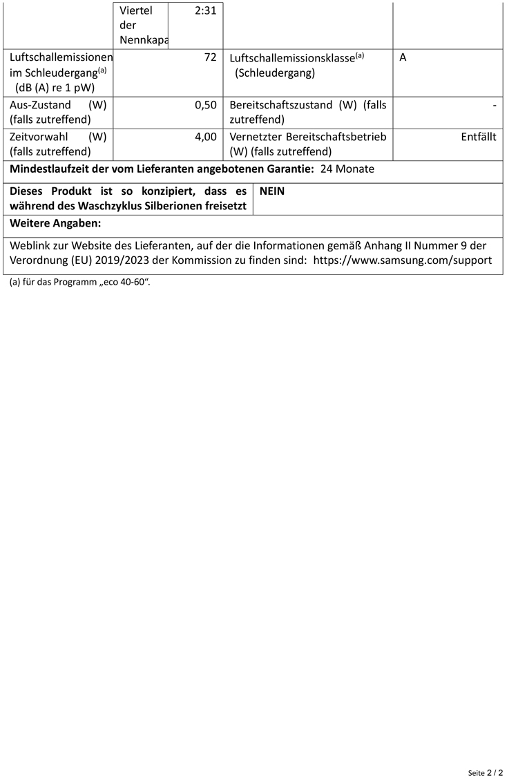 - Luftschallemissionen während des Schleuderzyklus2) dB(A) re 1pW 72