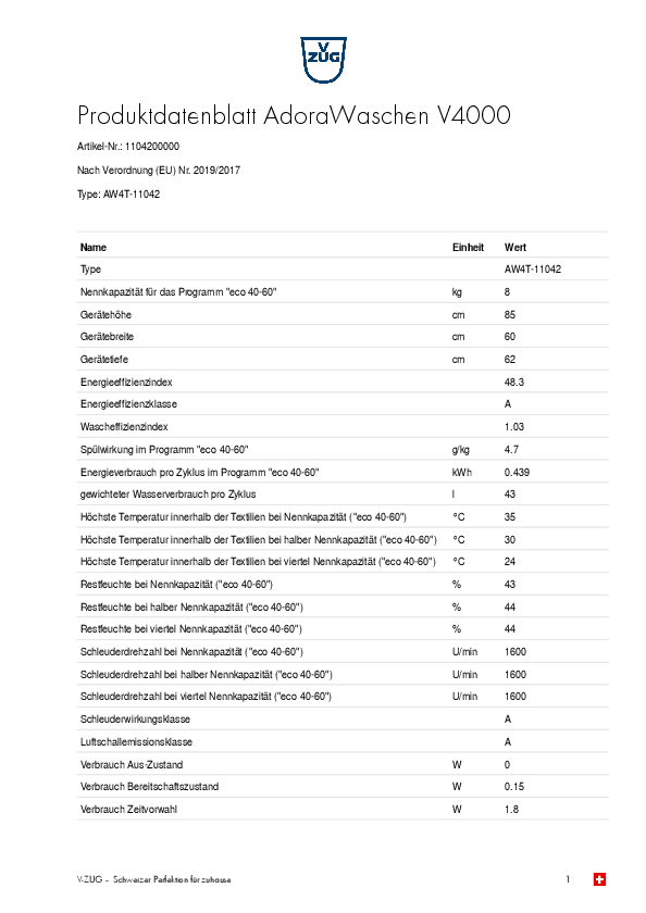 V-ZUG AdoraWaschen V4000, Waschmaschine, 8kg, AW4T-11042, EEK: A+, mit 5 Jahren Garantie!