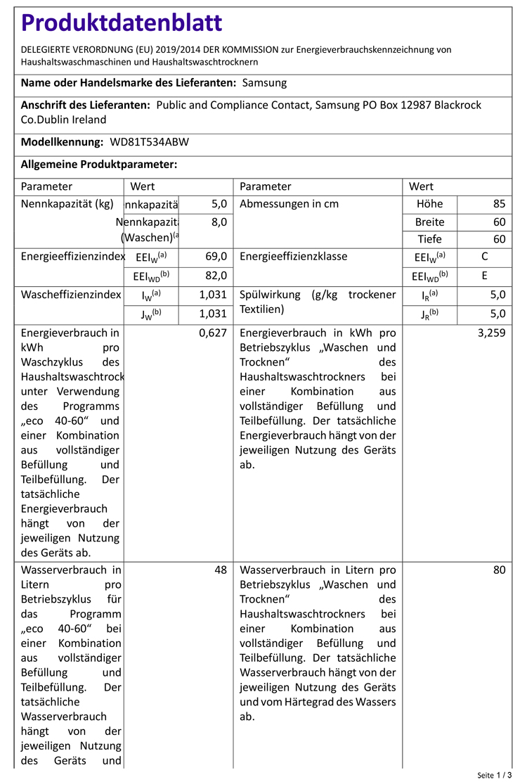 - Energieeffizienzklasse (kompletter Betriebszyklus E