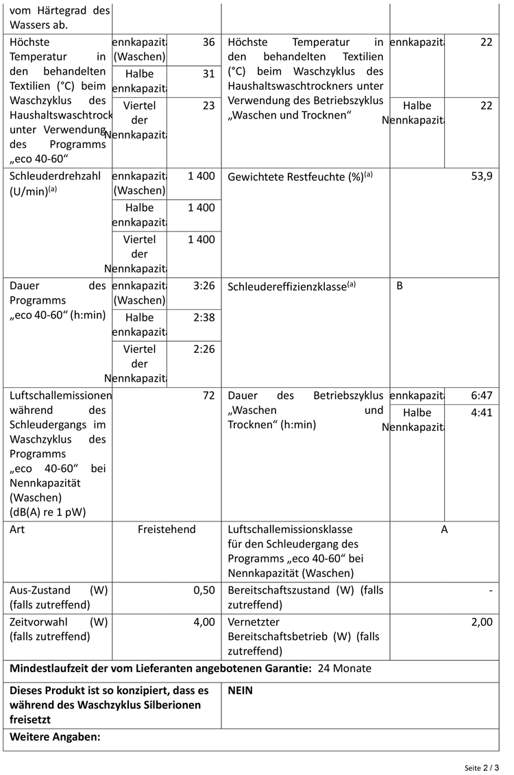 - Gewichteter Energieverbrauch (kompletter Betriebszyklus kWh/100 Zyklen 326