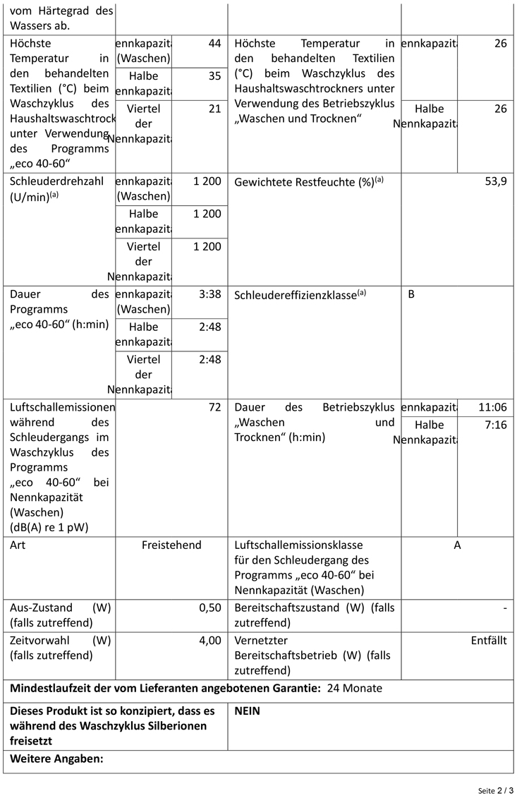 - Gewichteter Energieverbrauch (kompletter Betriebszyklus) kWh/100 Zyklen 397